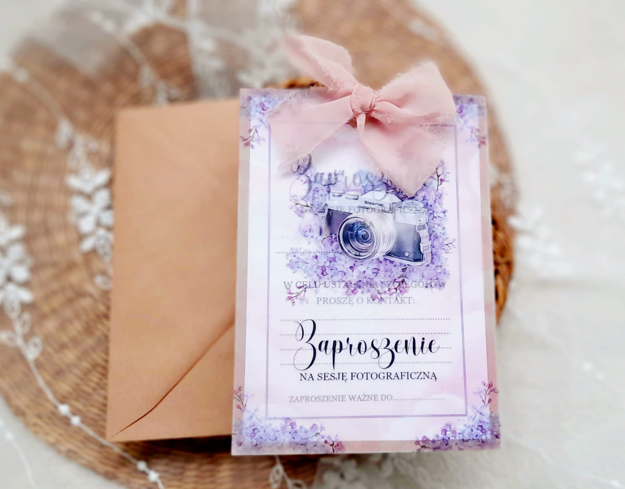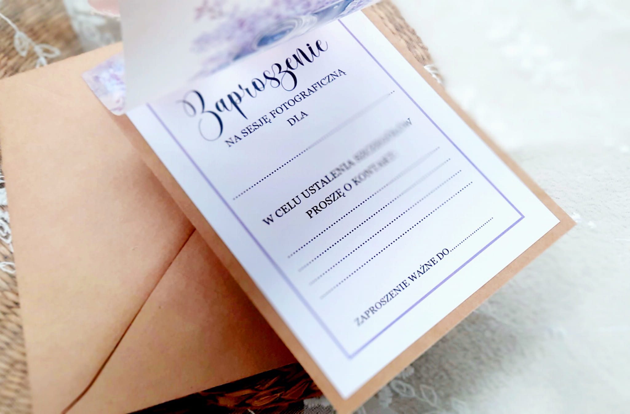 Zaproszenia na sesję na podkładzie eko, z kalką z motywem graficznym oraz szyfonową wstążeczką. Format 12x17cm. W komplecie z eko kopertą.