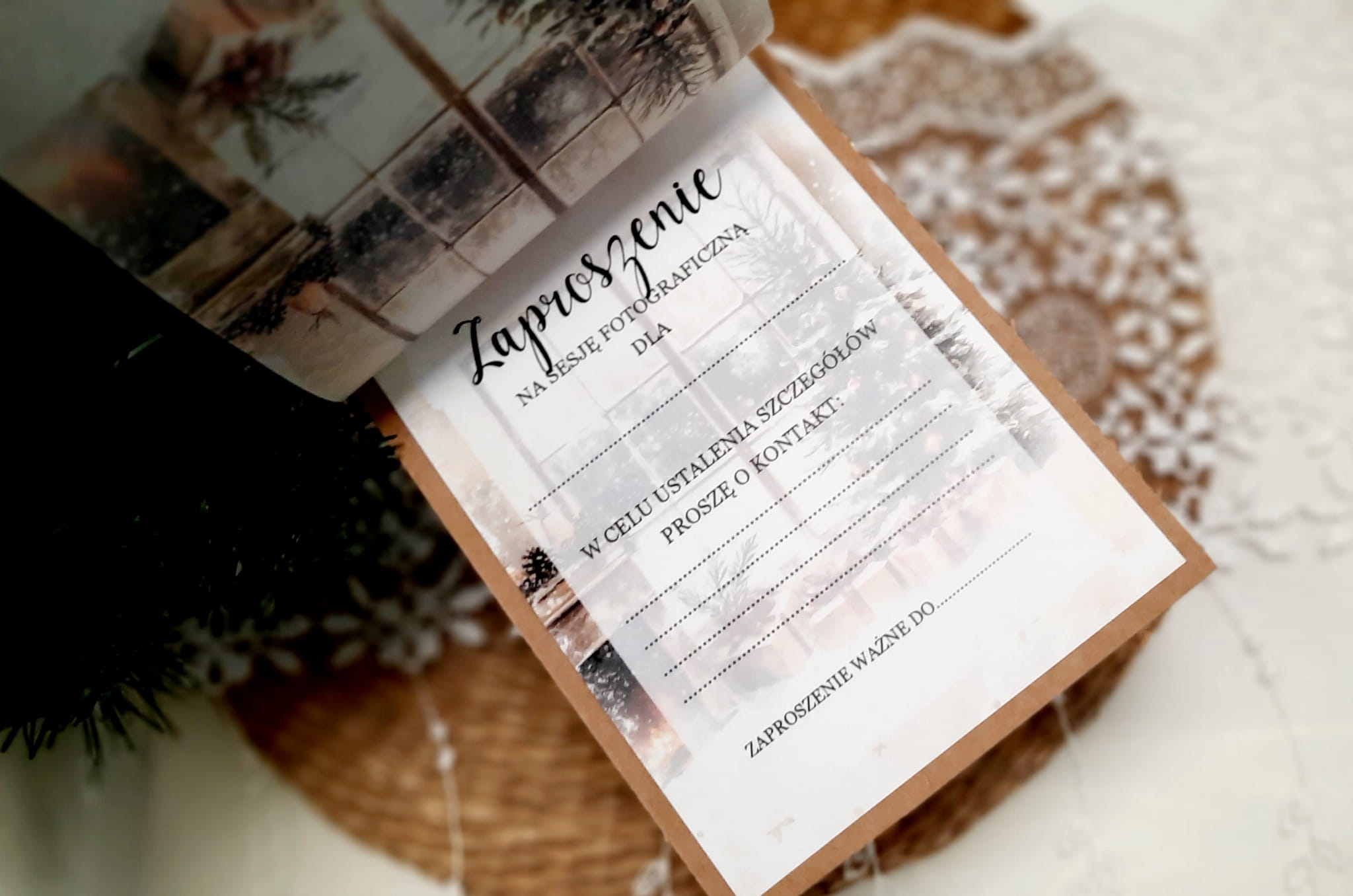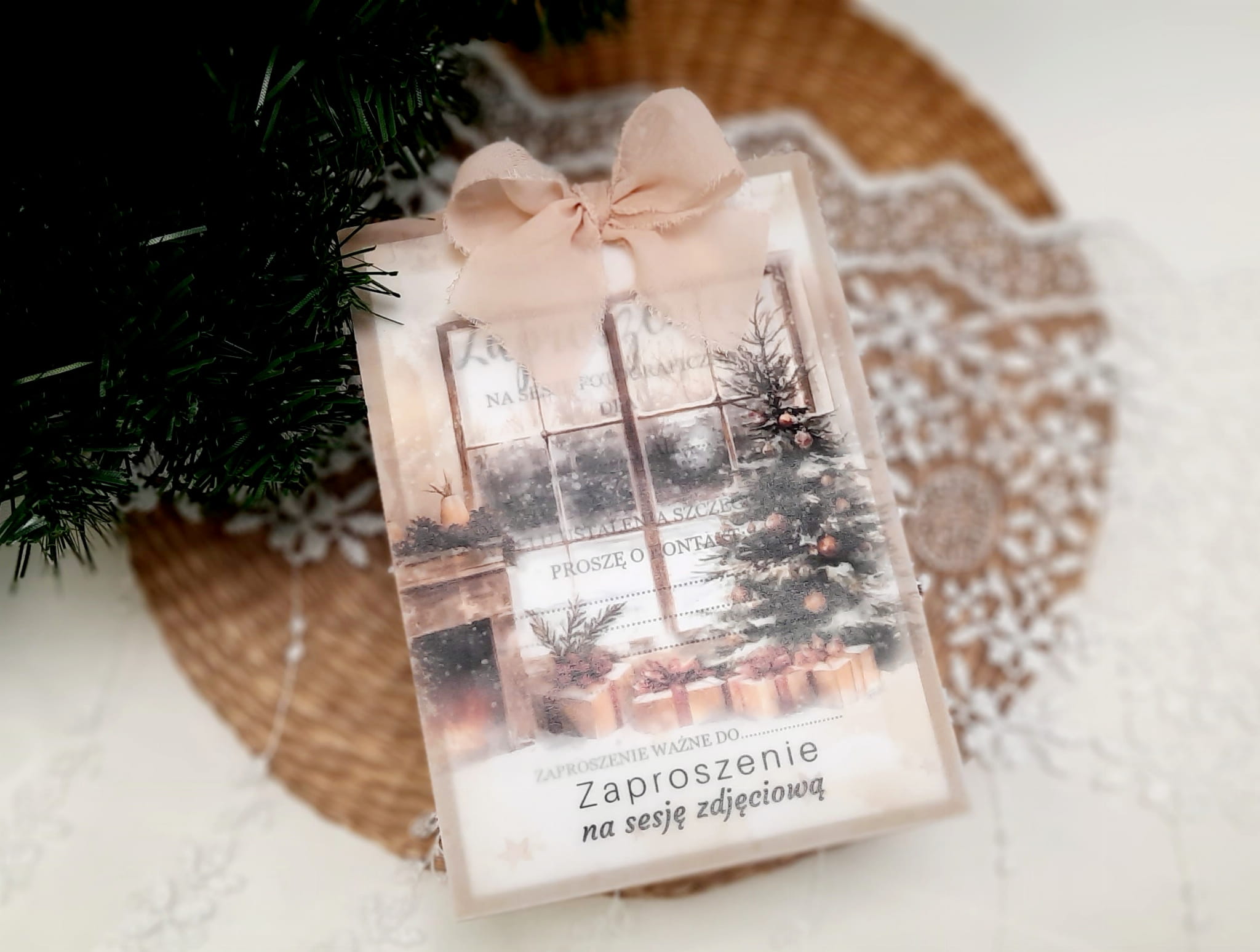 Zaproszenia na sesję na podkładzie eko, z kalką z motywem graficznym oraz szyfonową wstążeczką.