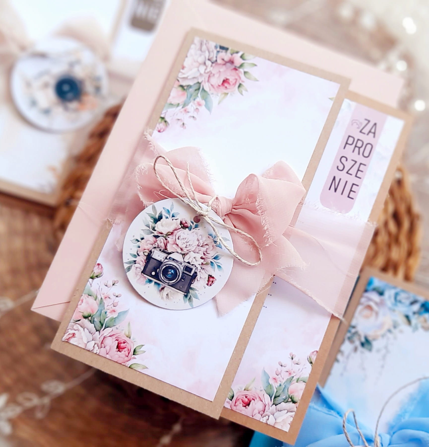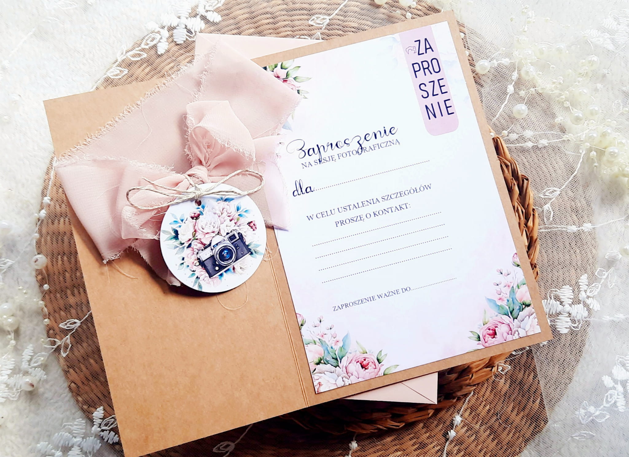 Zaproszenia na sesję na podkładzie eko, z motywem graficznym oraz szyfonową wstążeczką. Format 12x17cm. W komplecie z kopertą w kolorze pudrowy róż.