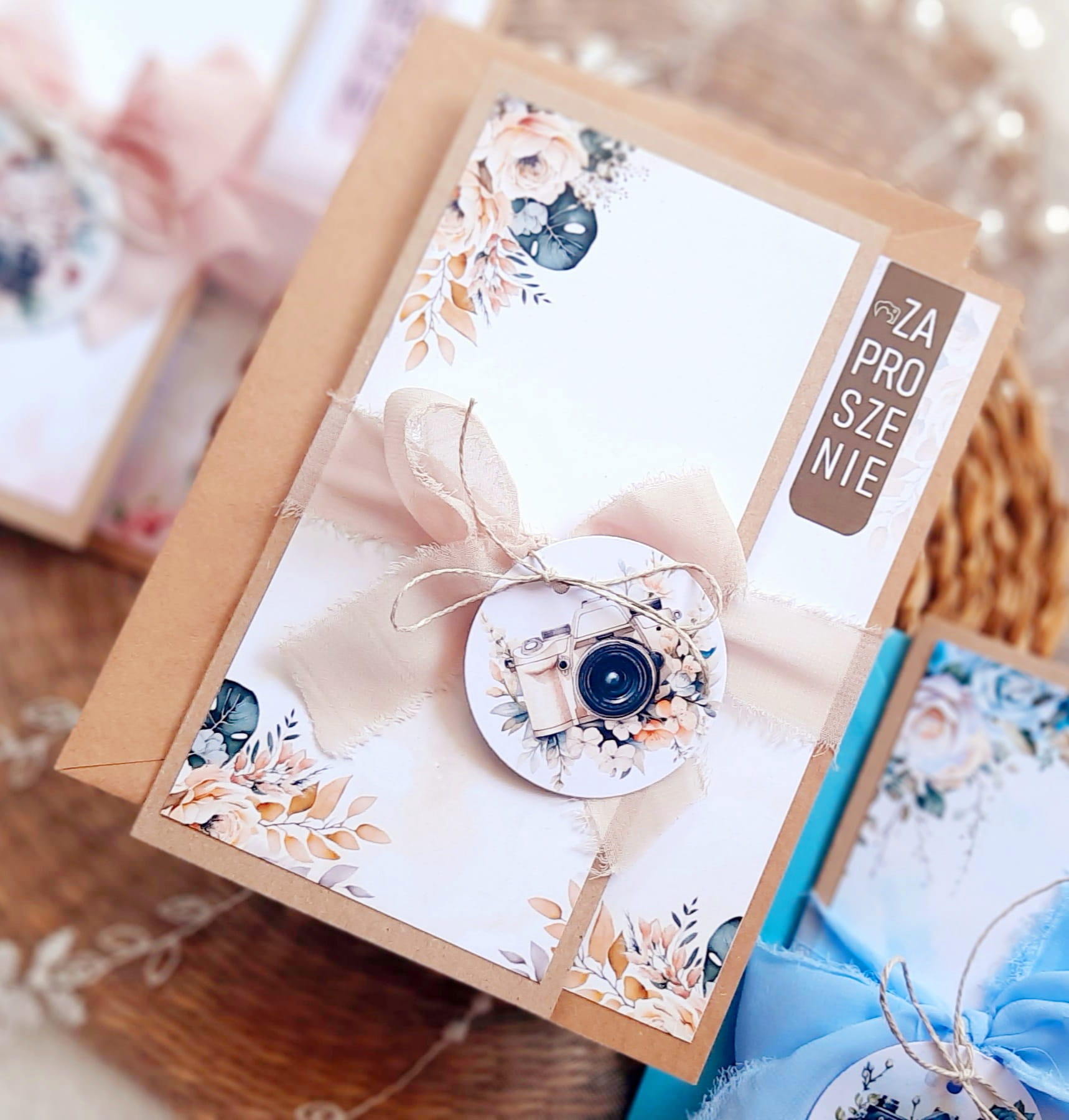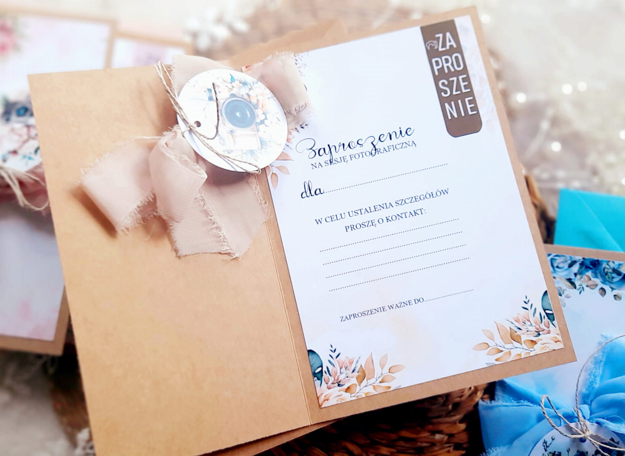 Zaproszenia na sesję na podkładzie eko, z motywem graficznym oraz szyfonową wstążeczką.