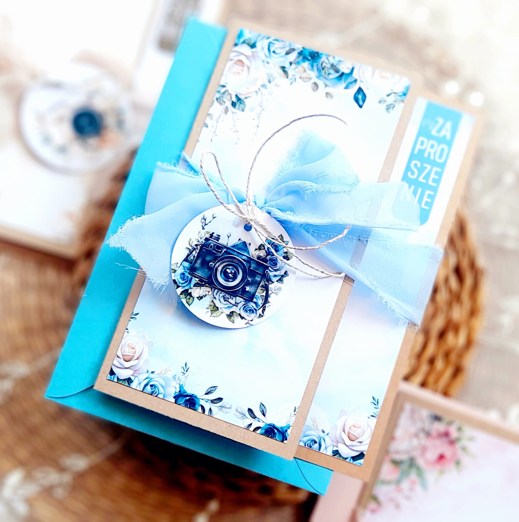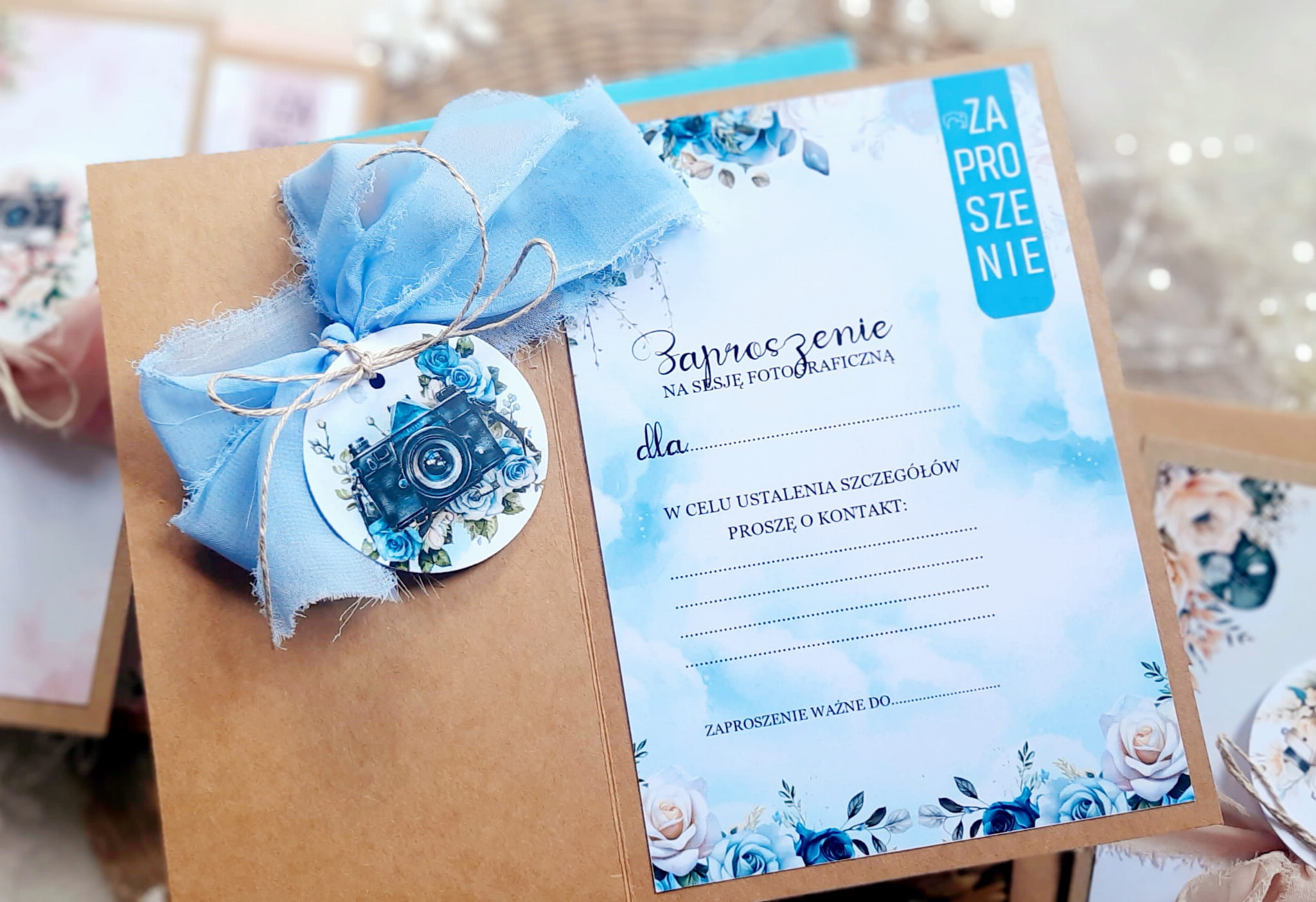Zaproszenia na sesję na podkładzie eko, z motywem graficznym oraz szyfonową wstążeczką. Format 12x17cm. W komplecie z kopertą w kolorze niebieskim.