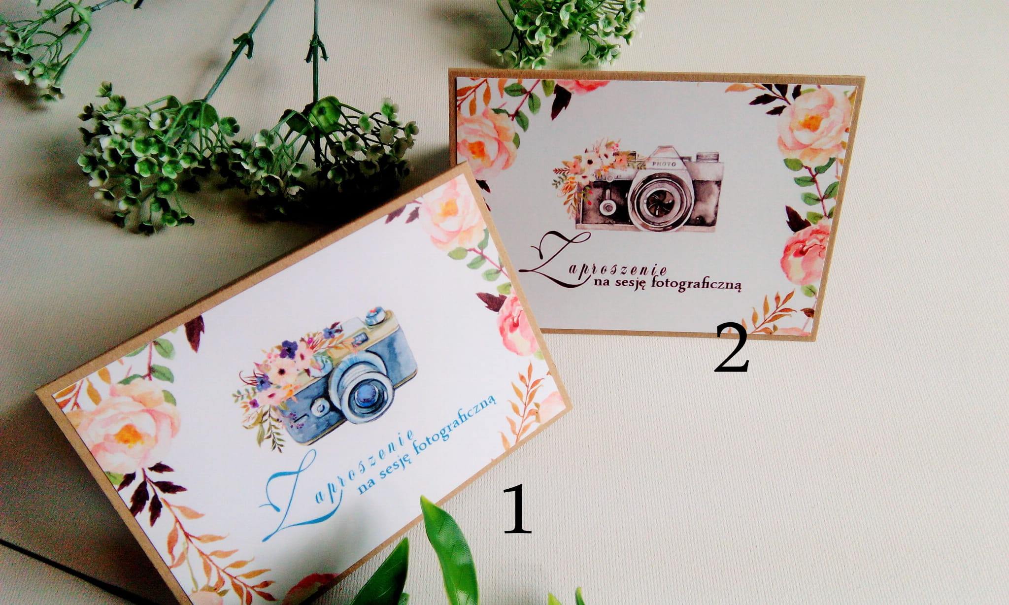 Zaproszenia na sesję na podkładzie eko z motywem graficznym - niebieski aparat. Format 10,5x14,8 cm. W komplecie z białą kopertą.