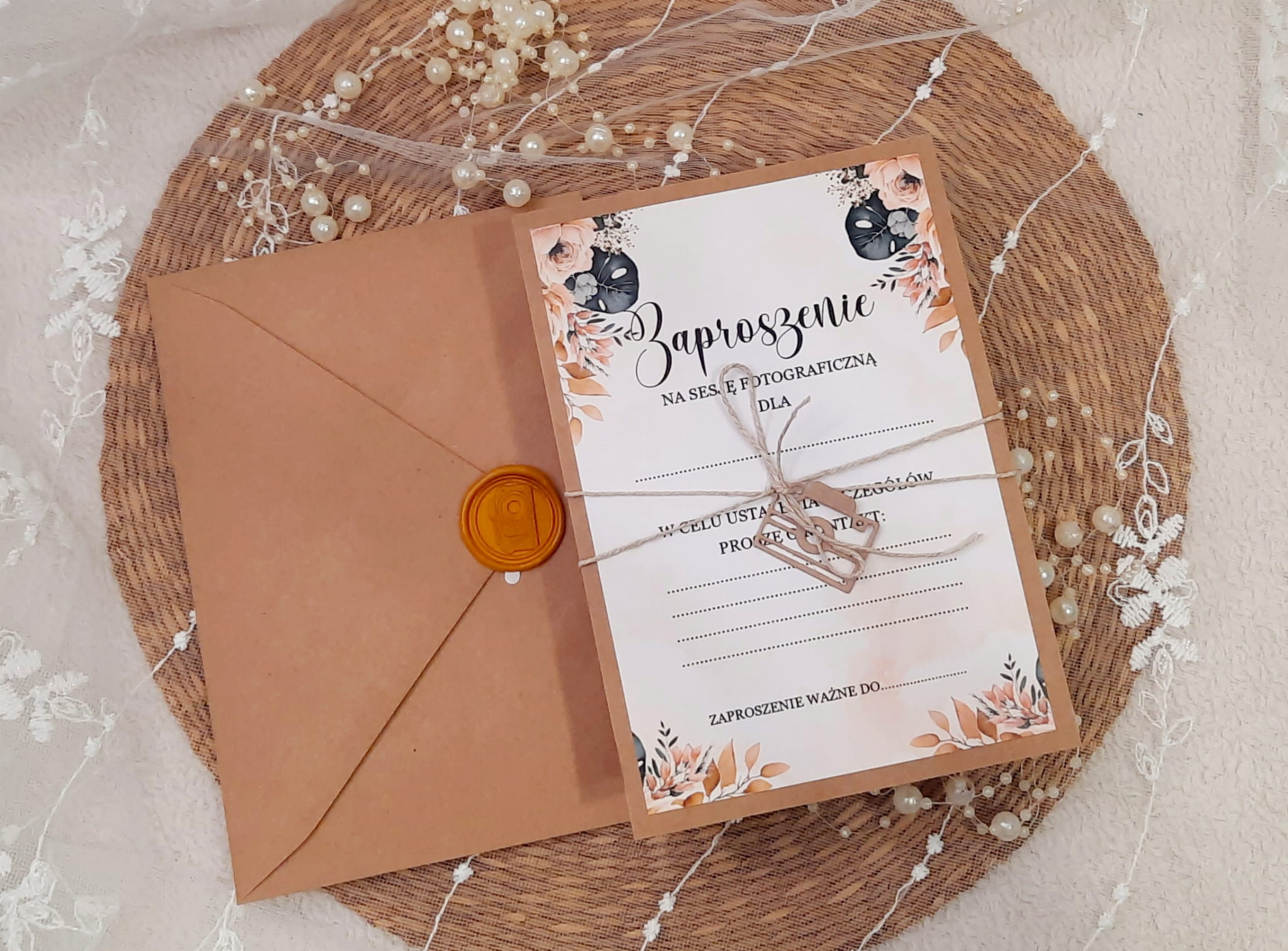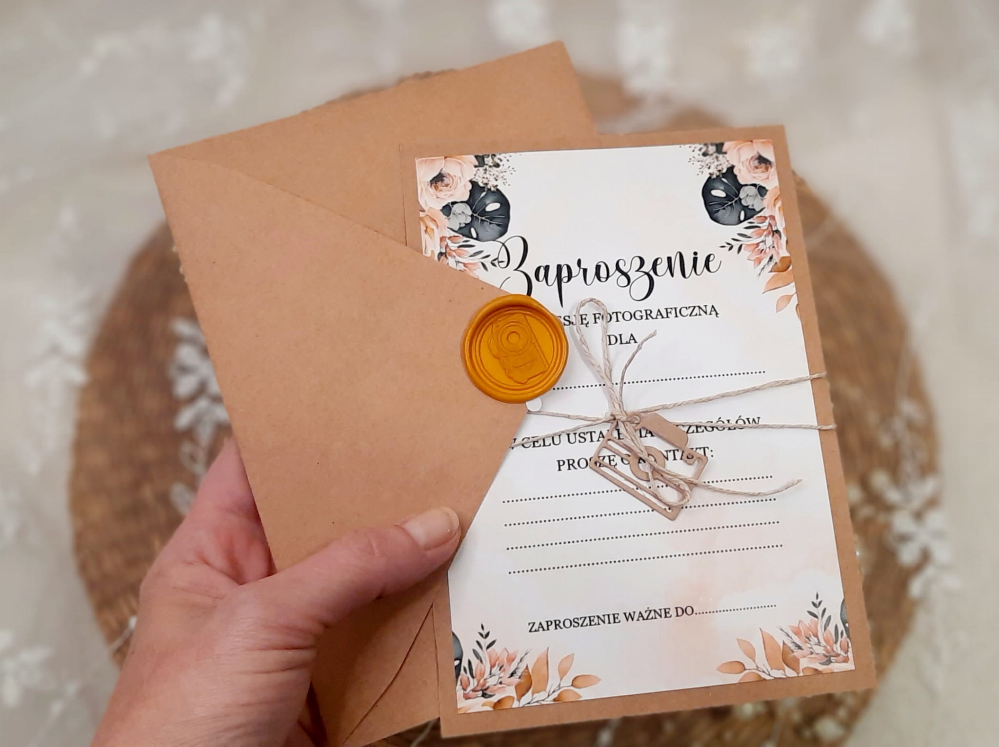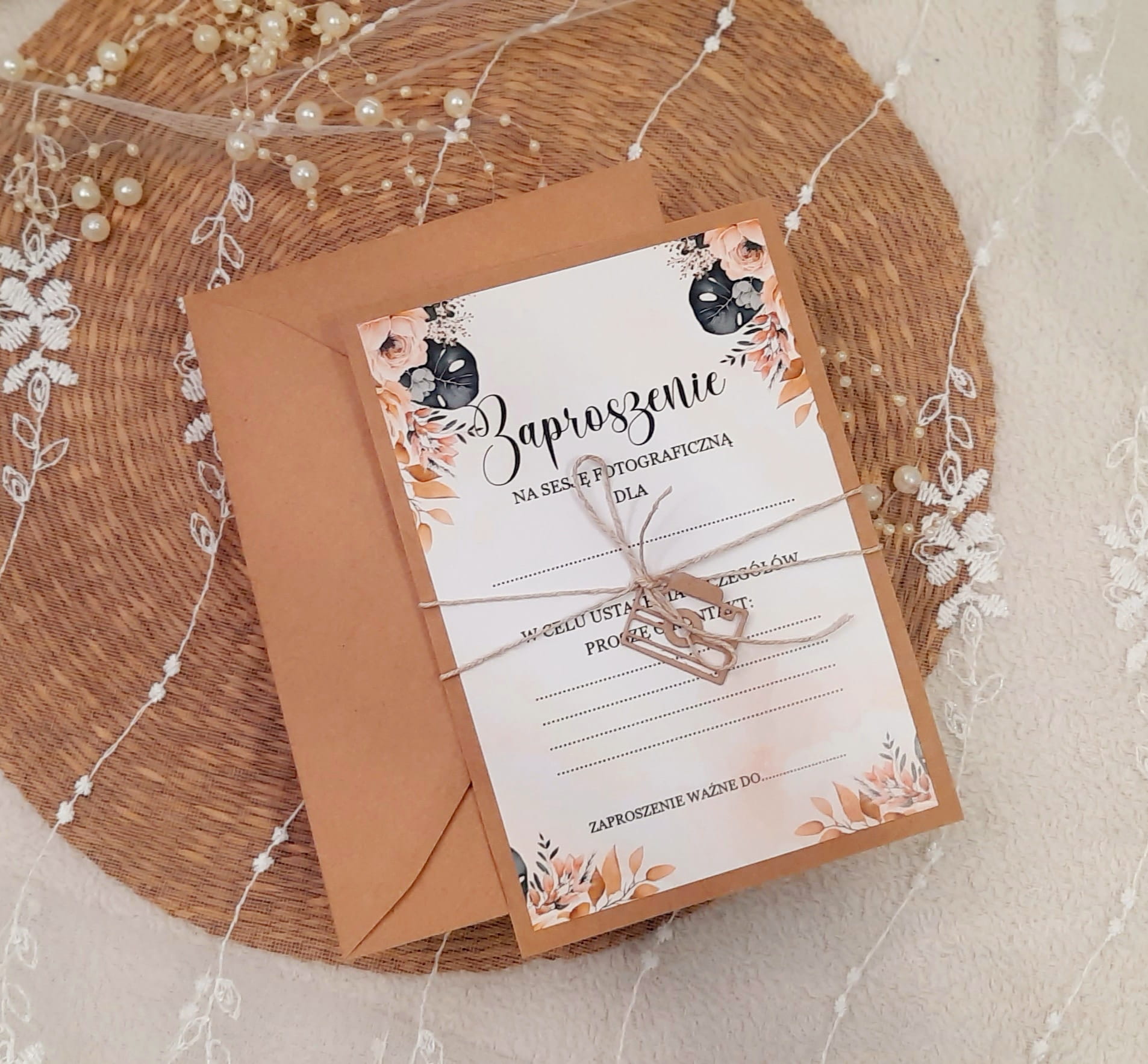 Zaproszenia jednokartkowe, jednostronne na sesję na podkładzie eko, z motywem graficznym, sznureczkiem i przywieszką w kształcie aparatu.