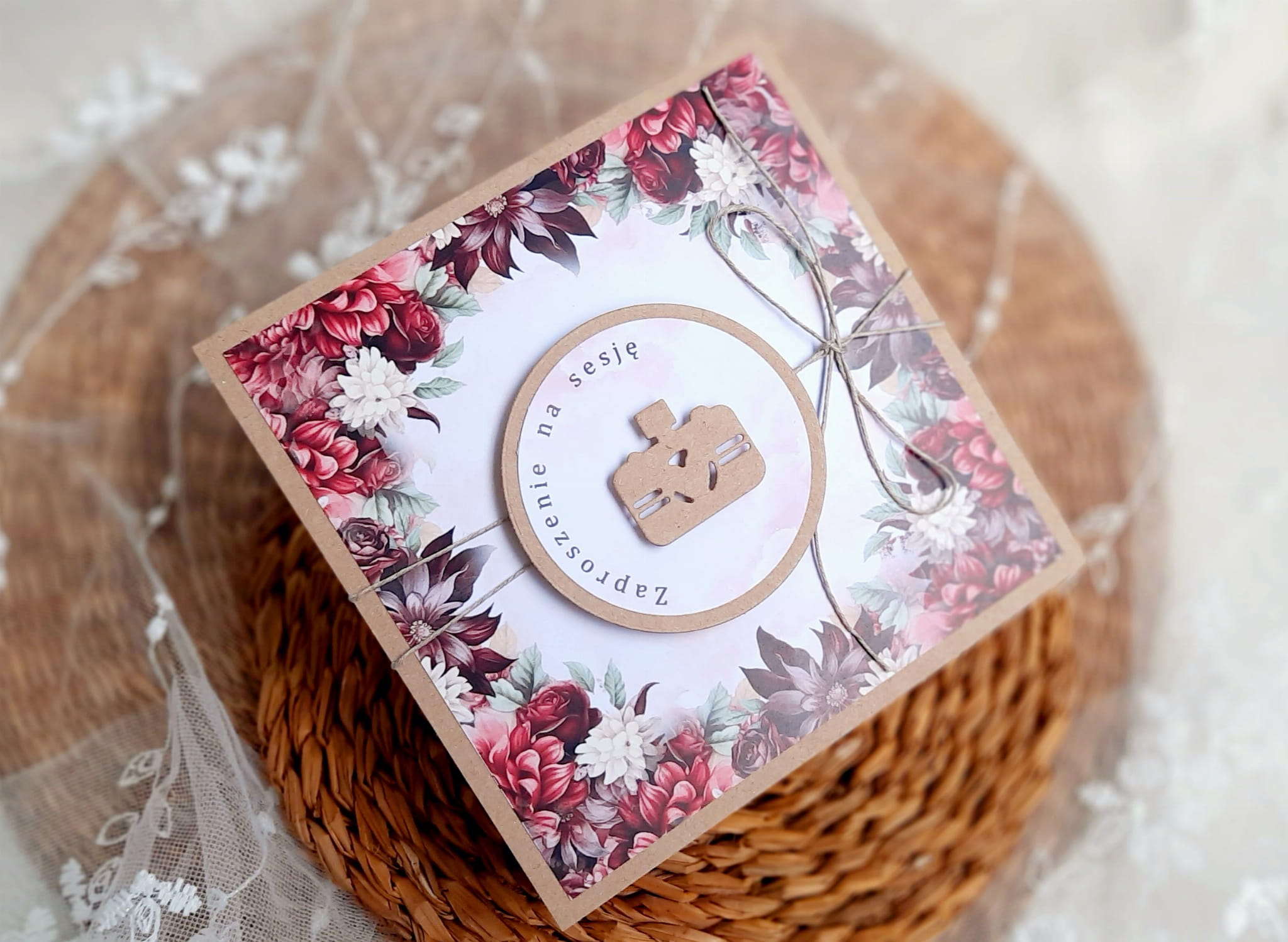 Zaproszenia na sesję na podkładzie eko z motywem graficznym i małym aparacikiem.