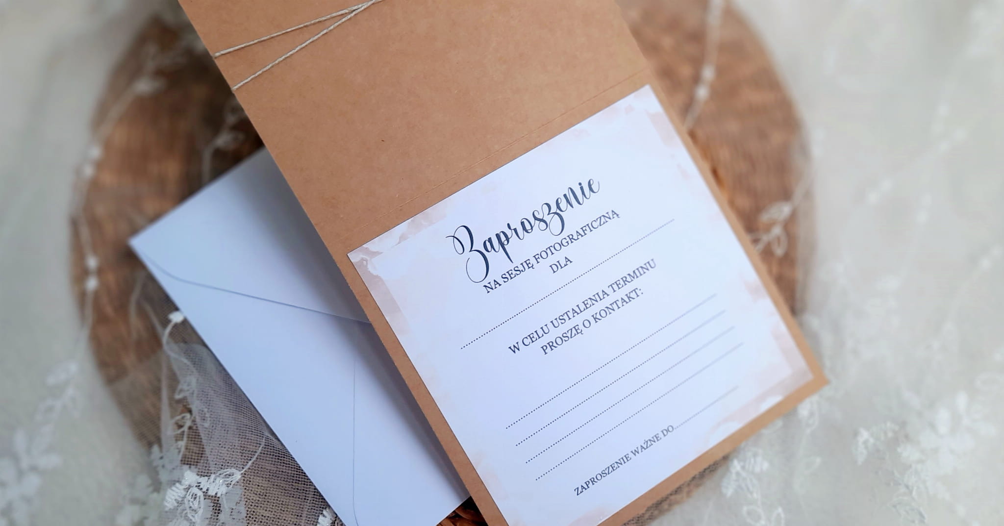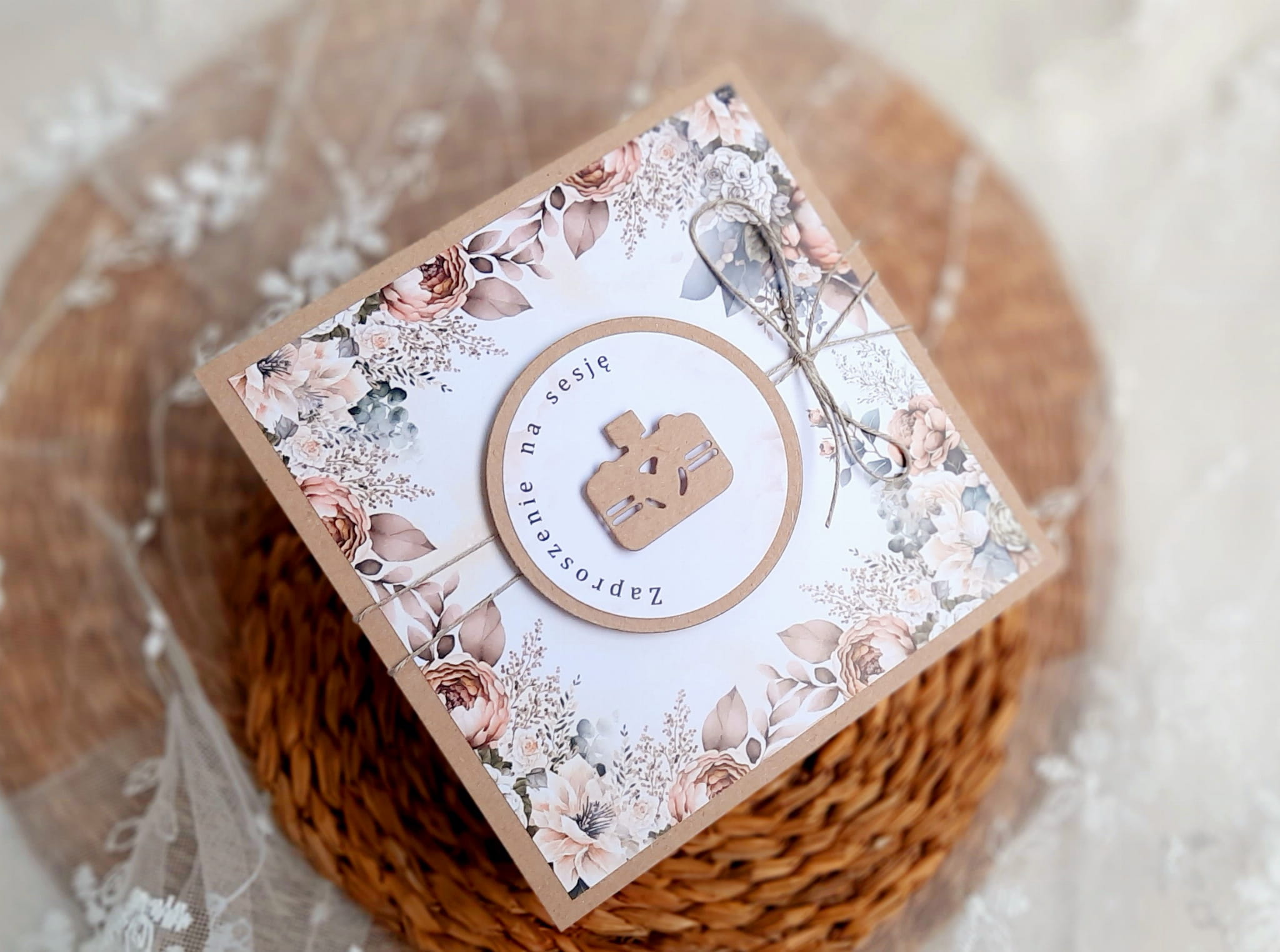 Zaproszenia na sesję na podkładzie eko z motywem graficznym i małym aparacikiem.