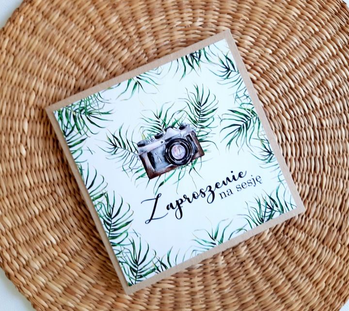 Zaproszenia na sesję na podkładzie eko z motywem graficznym. Format 14cm.