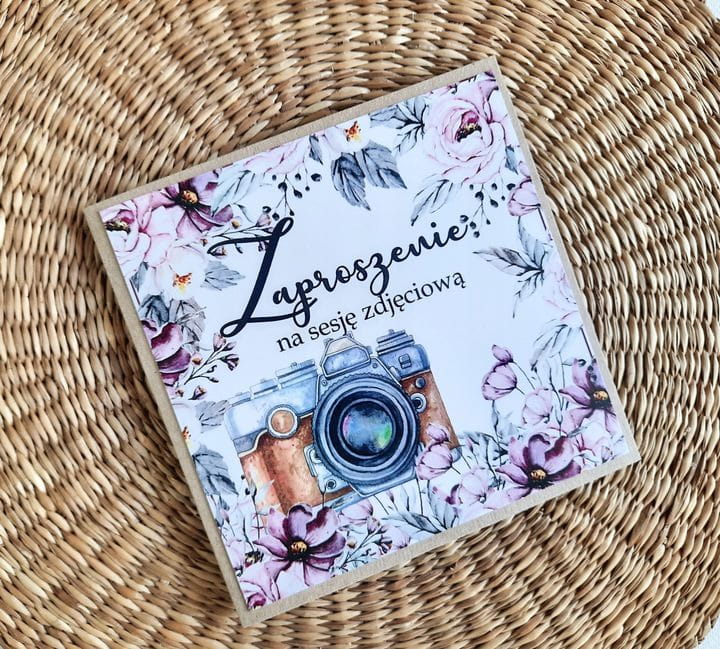 Zaproszenia na sesję na podkładzie eko z motywem graficznym. Format 14cm.