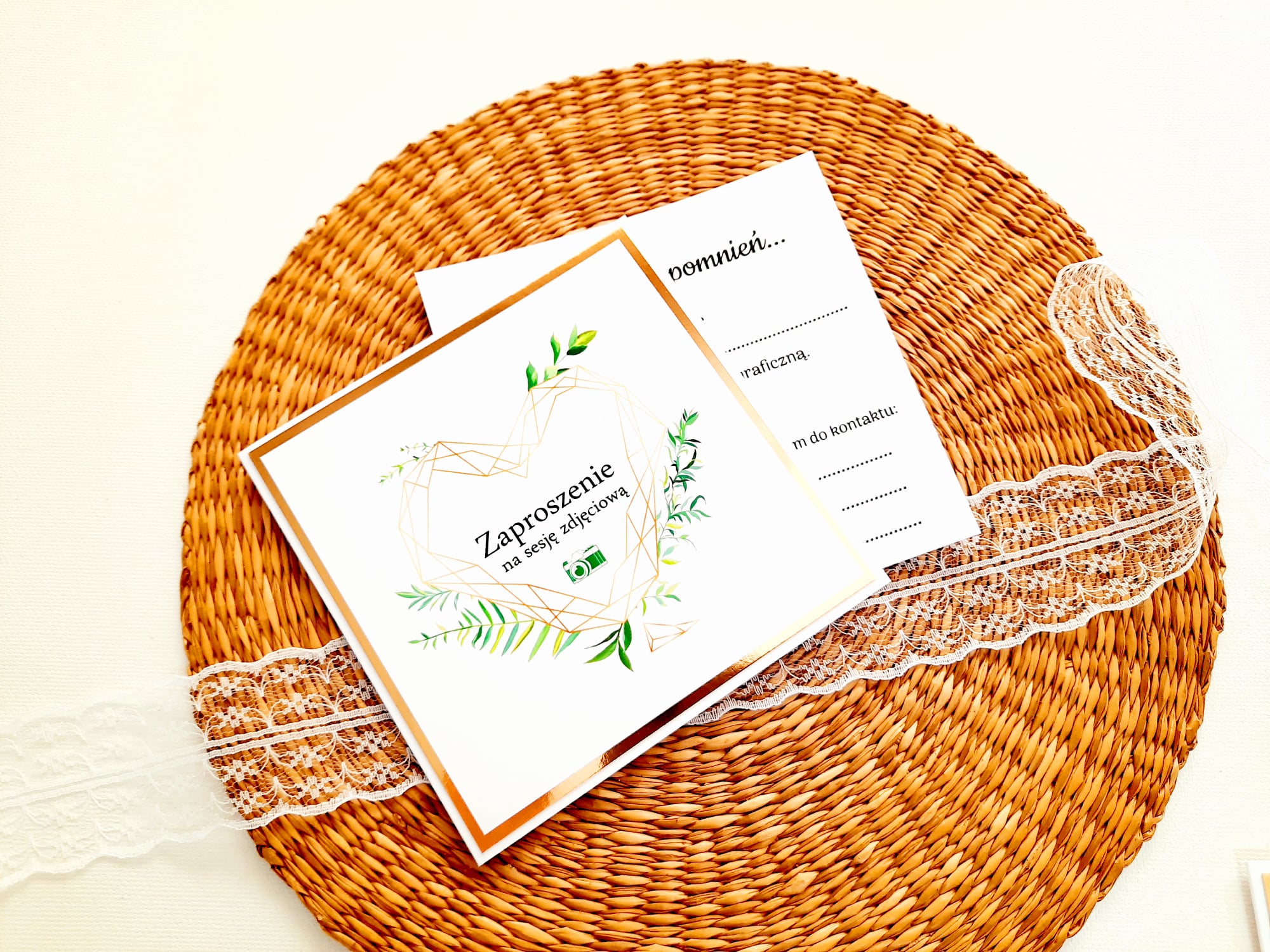 Zaproszenia na sesję z papierem lustrzanym i z motywem graficznym. Format 14cm.