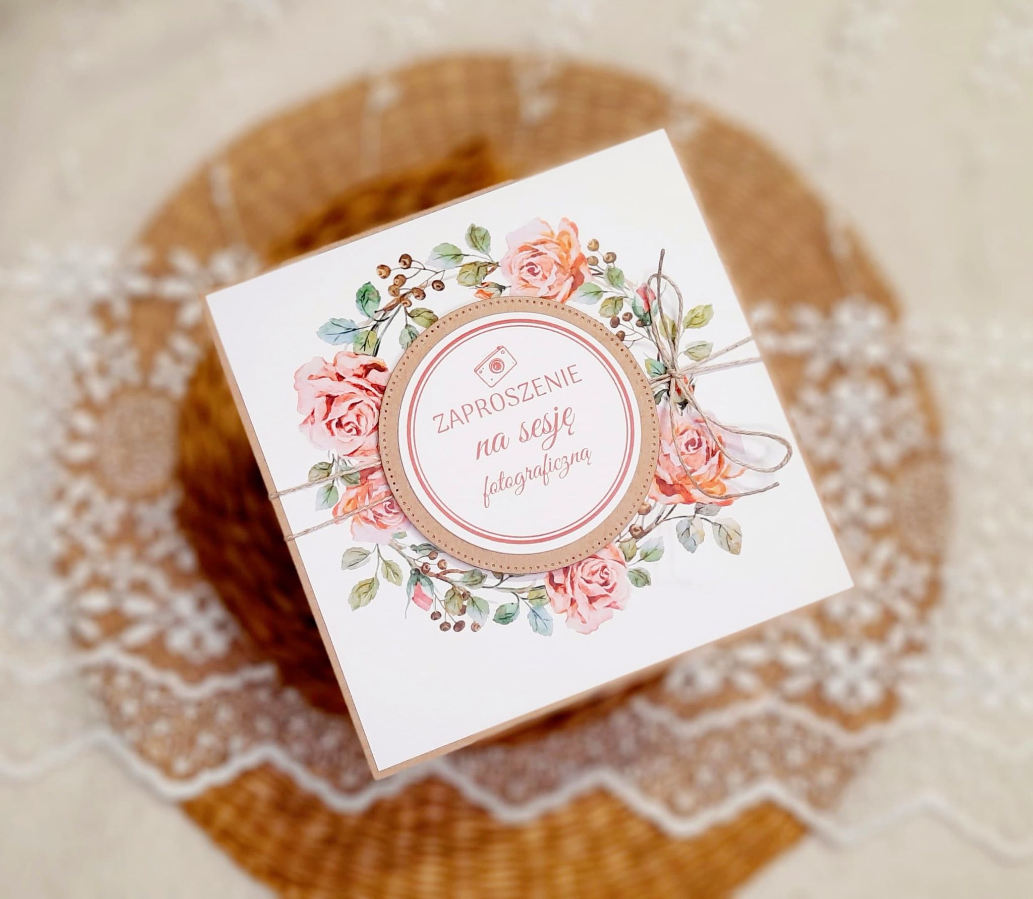 Zaproszenia na sesję na podkładzie eko z motywem graficznym. Format 14cm.