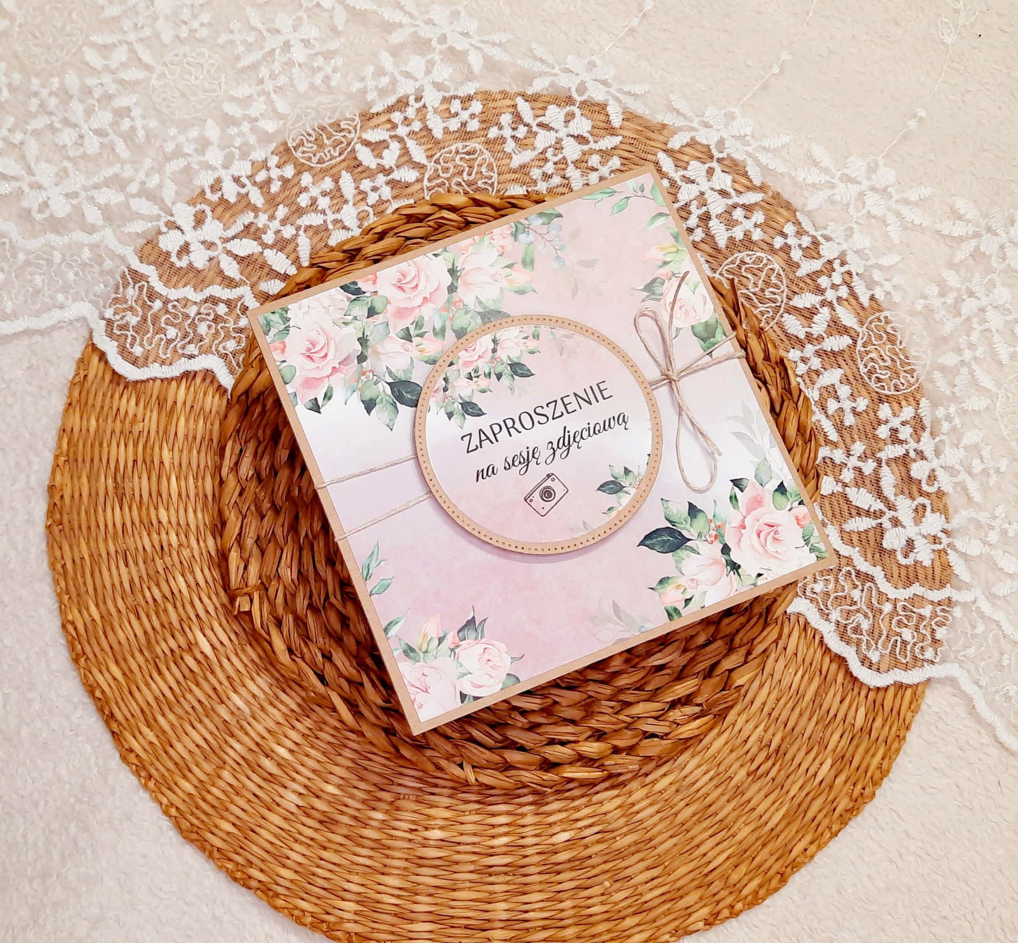 Zaproszenia na sesję na podkładzie eko z motywem graficznym. Format 14cm.