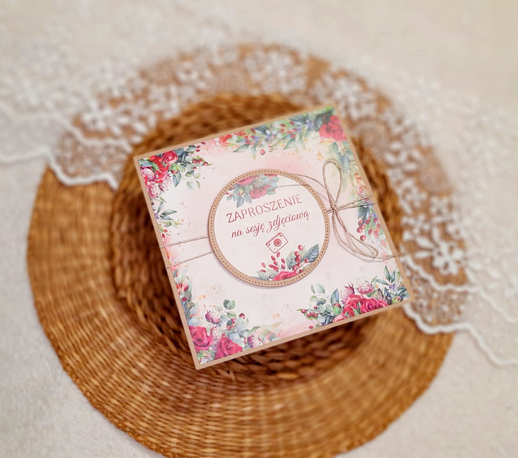 Zaproszenia na sesję na podkładzie eko z motywem graficznym. Format 14cm.