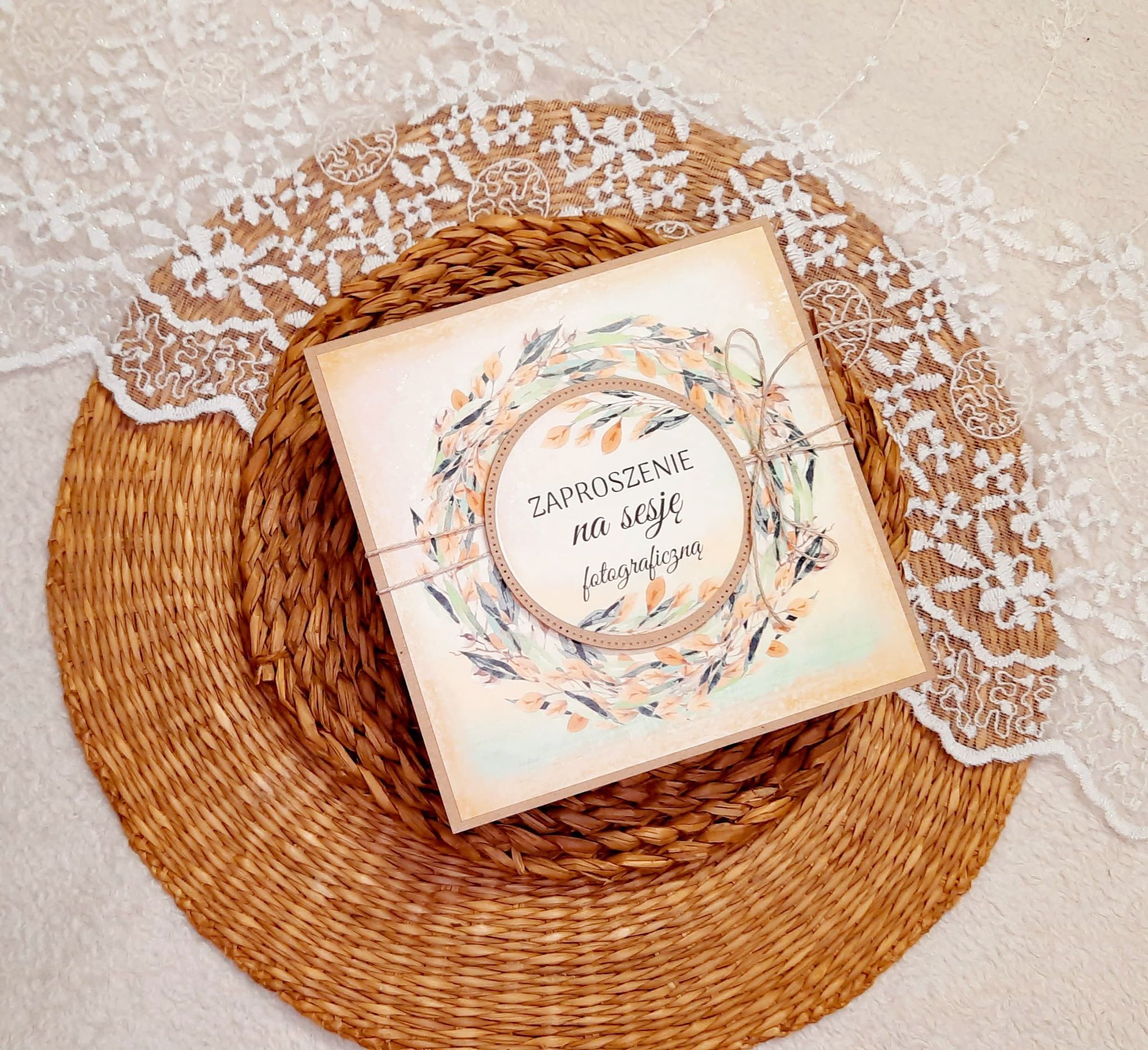 Zaproszenia na sesję na podkładzie eko z motywem graficznym. Format 14cm.