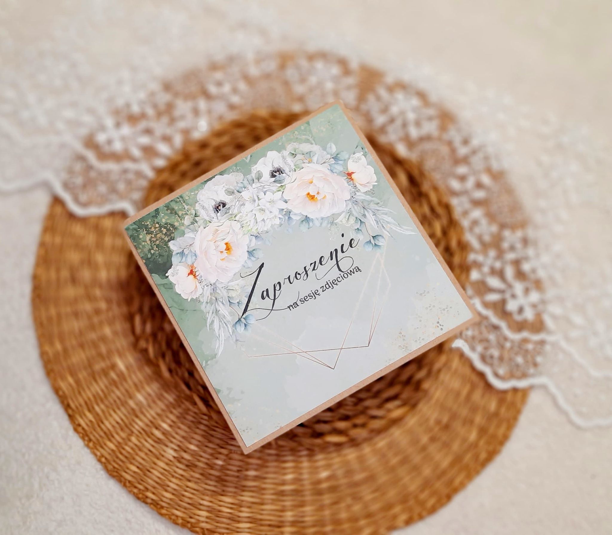 Zaproszenia na sesję na podkładzie eko z motywem graficznym. Format 14cm.