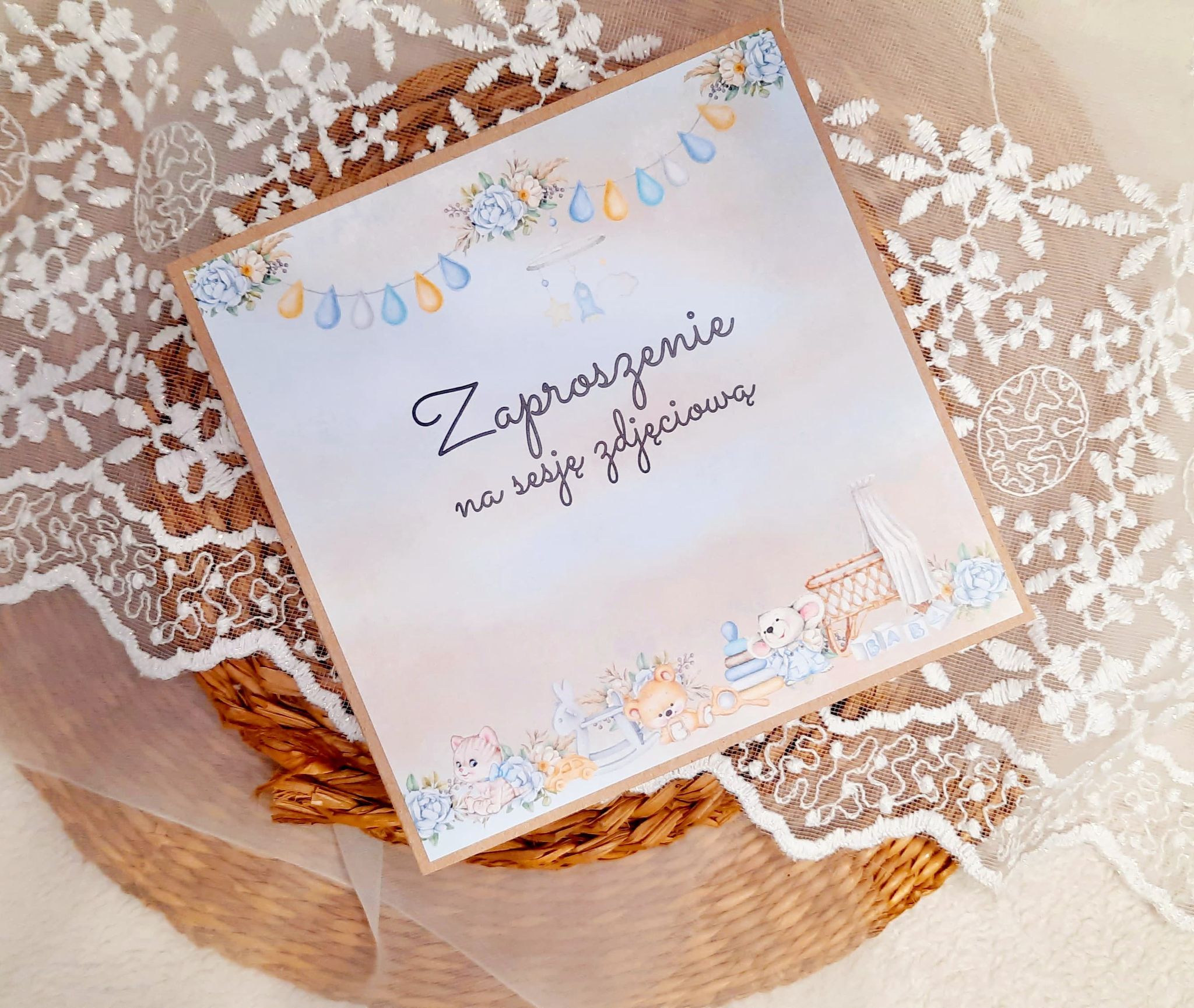 Zaproszenia na sesję na podkładzie eko z motywem graficznym. Format 14cm.