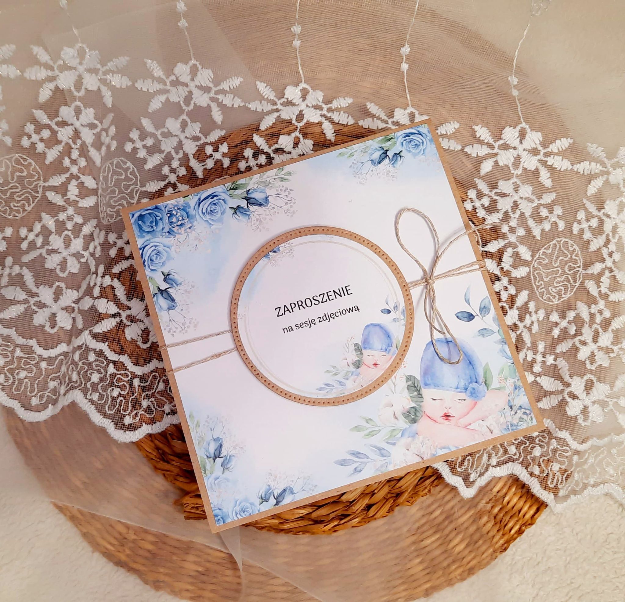 Zaproszenia na sesję na podkładzie eko z motywem graficznym. Format 14cm. W komplecie z białą kopertą.