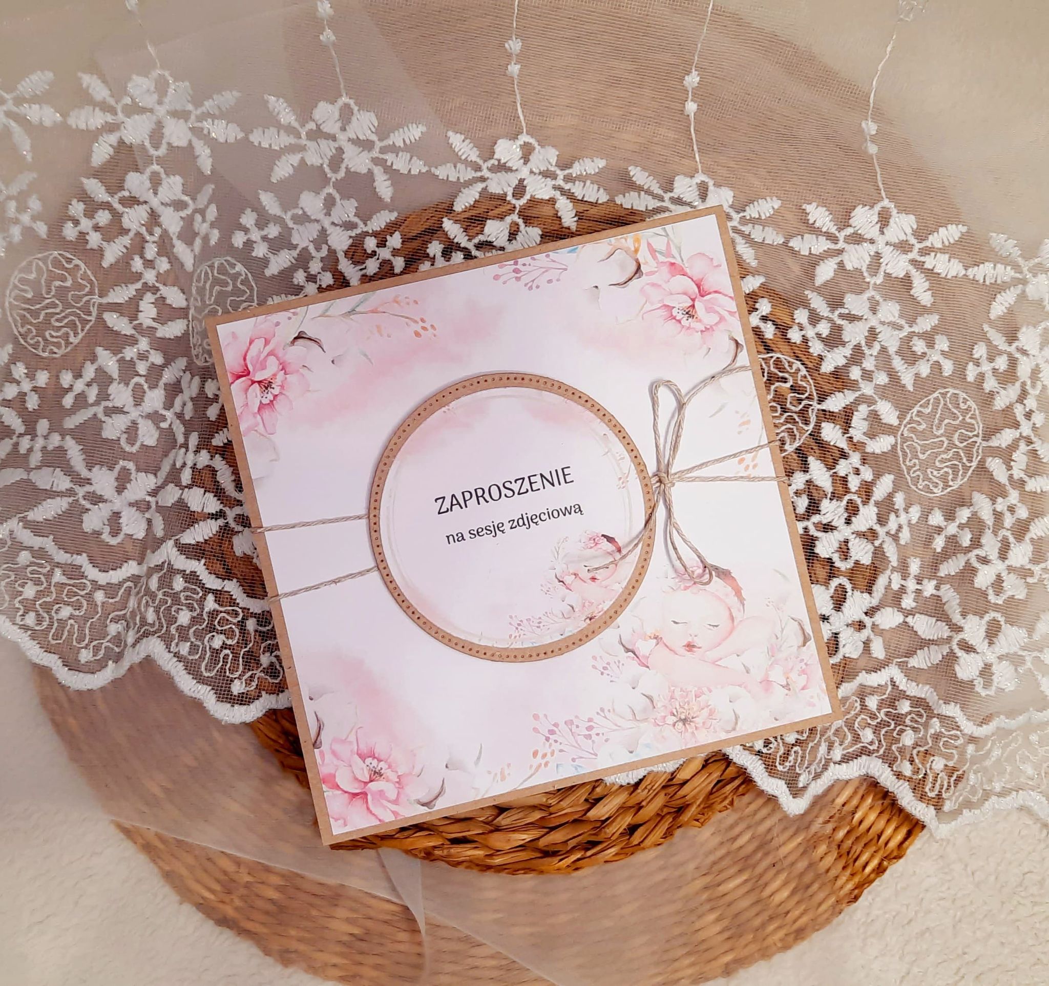 Zaproszenia na sesję na podkładzie eko z motywem graficznym. Format 14cm. W komplecie z białą kopertą.