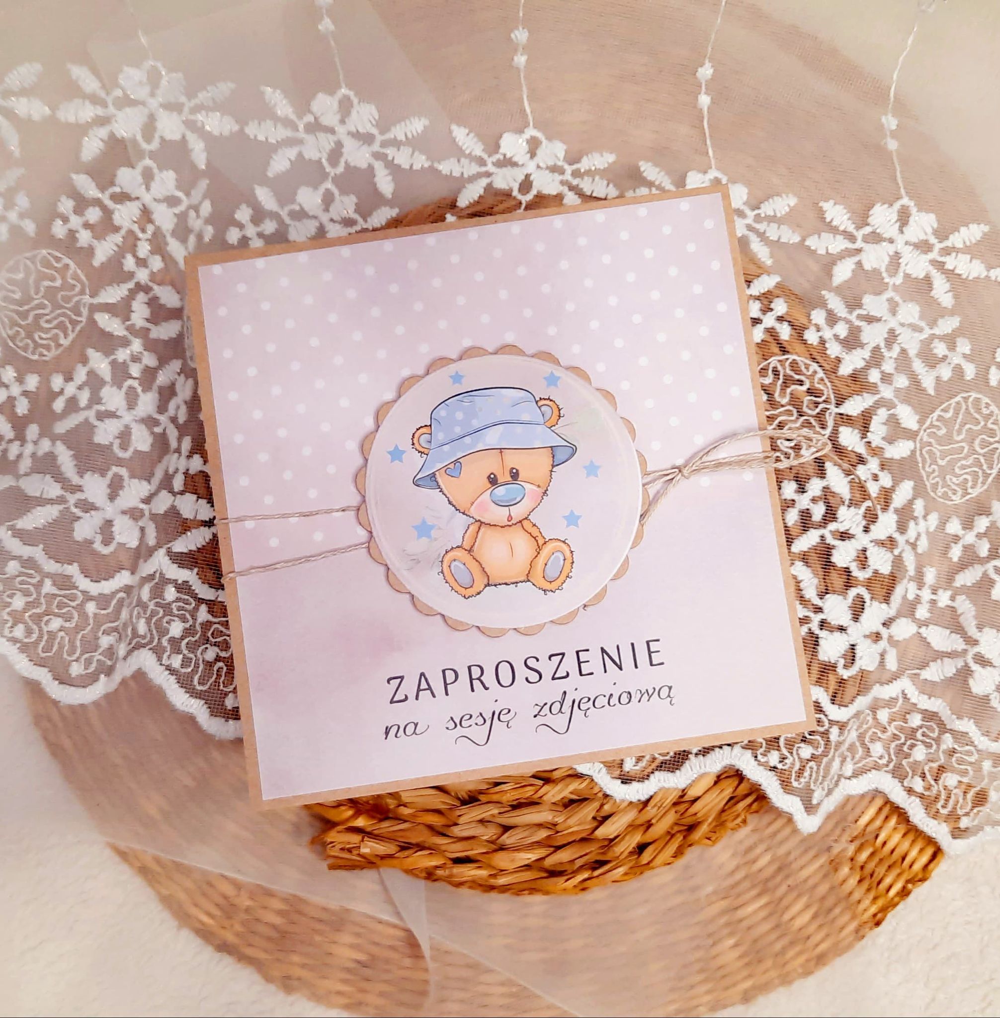 Zaproszenia na sesję na podkładzie eko z motywem graficznym. Format 14cm. W komplecie z białą kopertą.