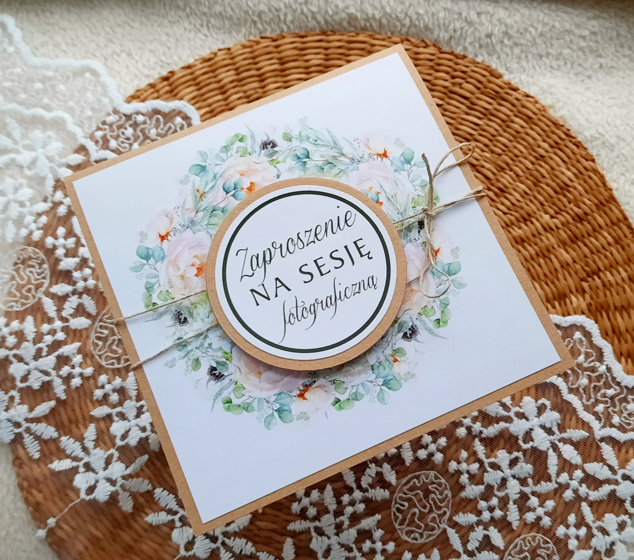 Zaproszenia na sesję na podkładzie eko z różowym motywem graficznym. Otwierane do góry.