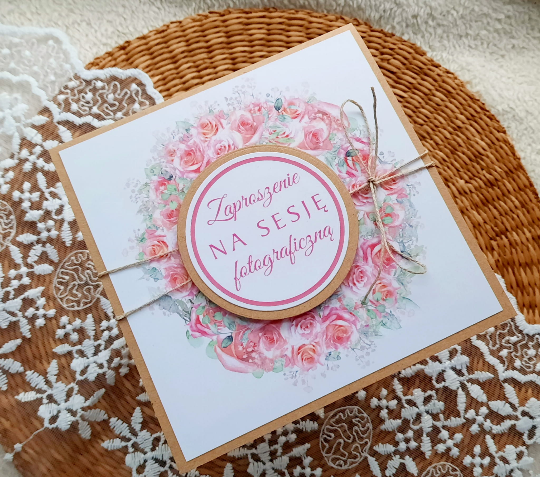 Zaproszenia na sesję na podkładzie eko z różowym motywem graficznym. Otwierane do góry.