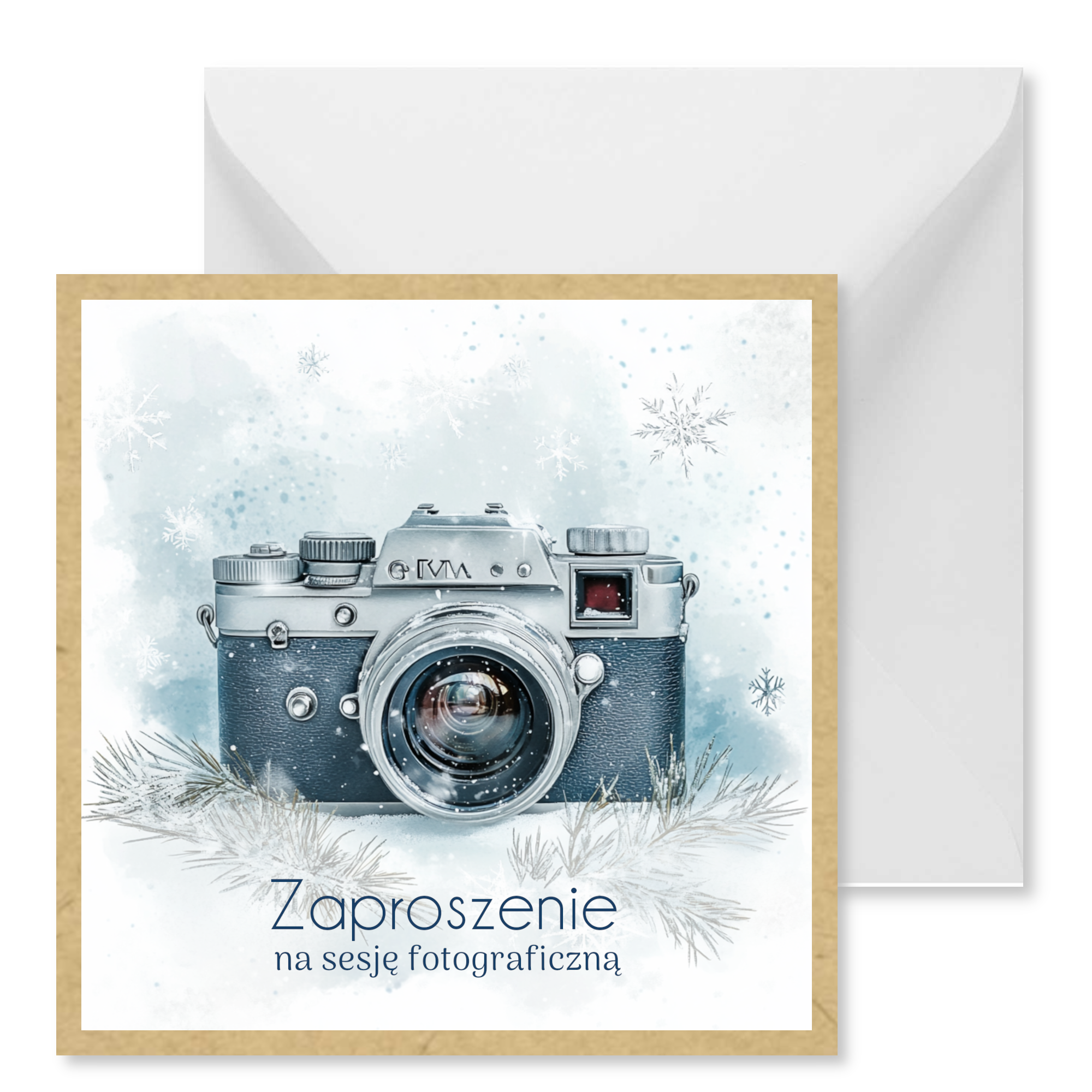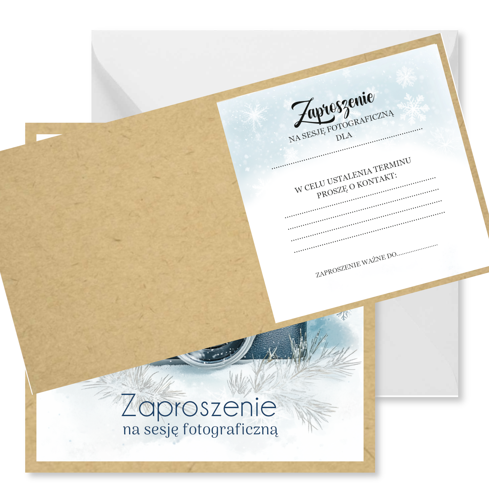Zaproszenia na sesję na podkładzie eko z motywem graficznym. Format 14cm. W komplecie z białą kopertą.