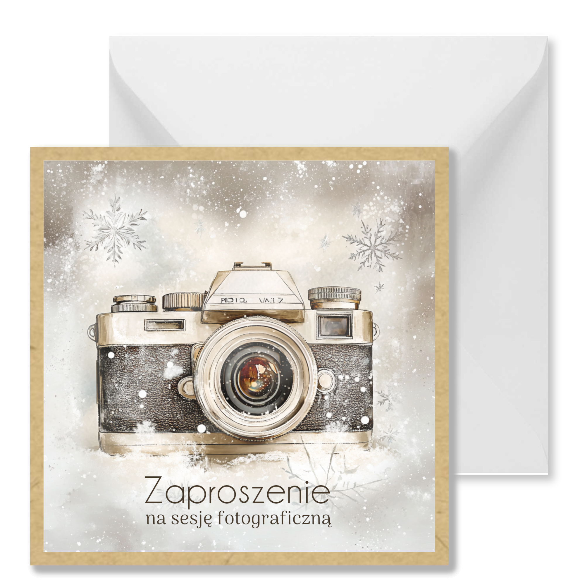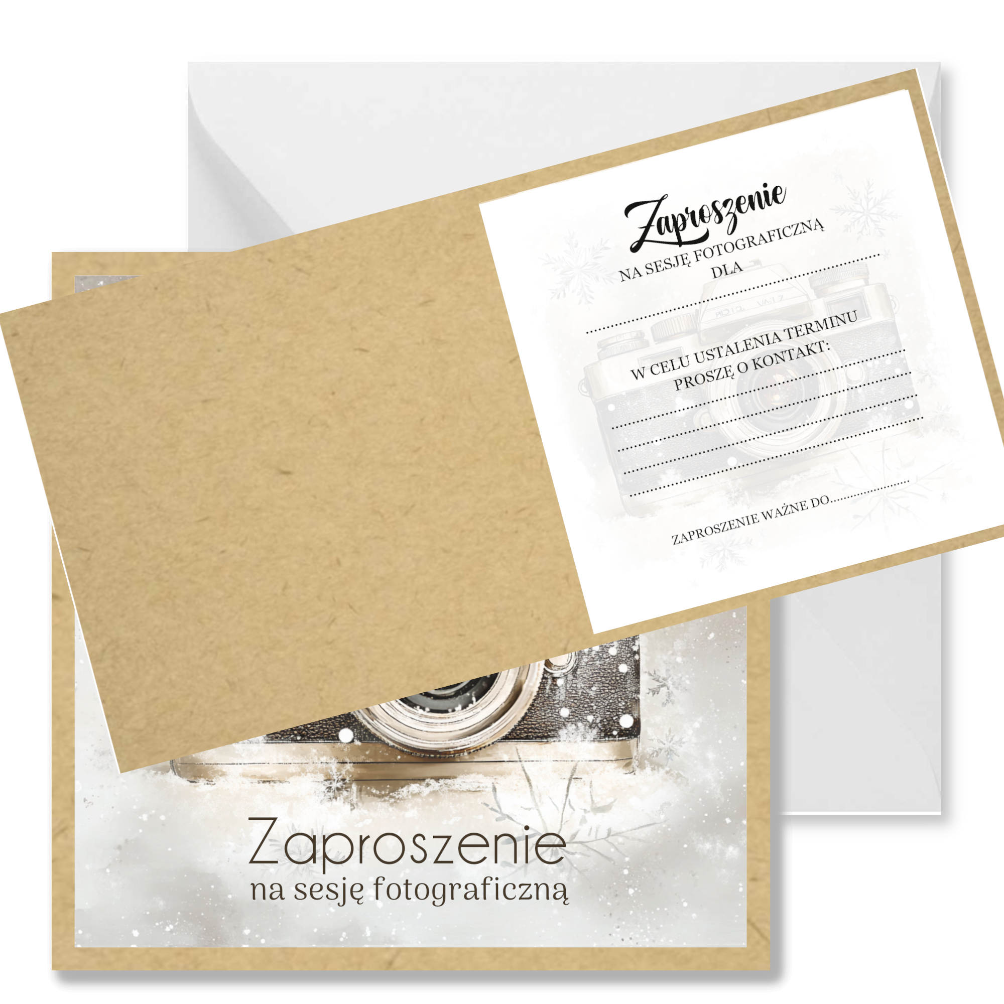 Zaproszenia na sesję na podkładzie eko z motywem graficznym. Format 14cm. W komplecie z białą kopertą.