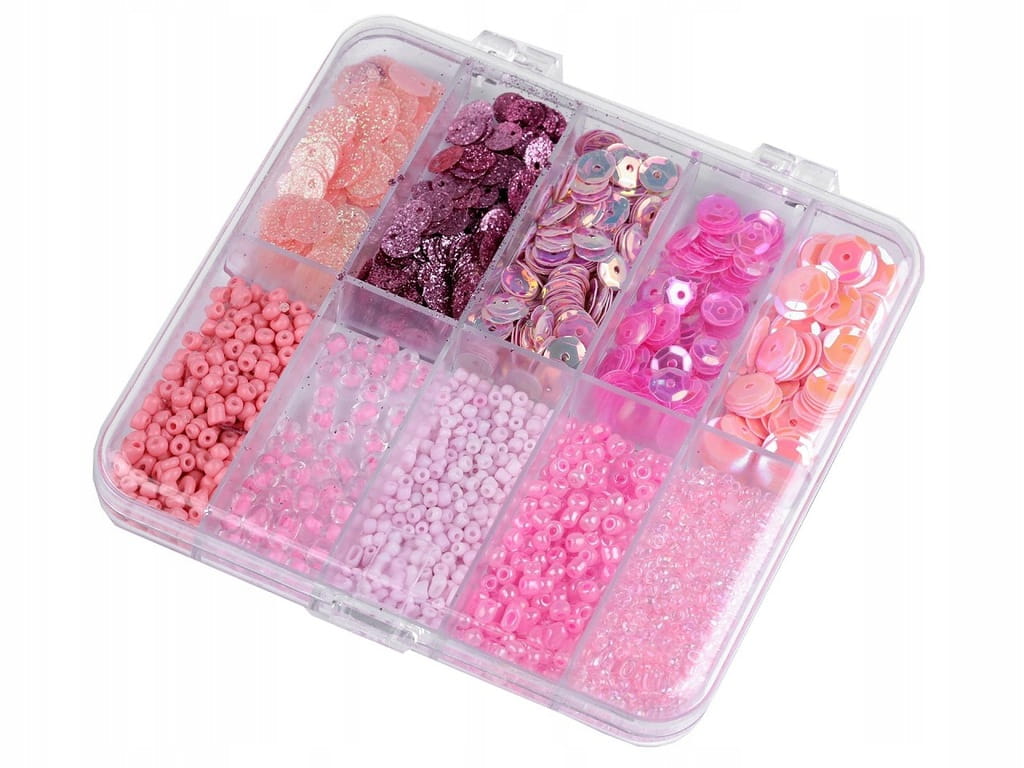 Zestaw koralików rokail i cekinów w plastikowym pudełku Kolor: 5 różowy Ilość: 1 kpl Skład-kompozycja: szkło, plastik Wymiary pudełka: 10 x 11 x 1,8 cm Średnica: 2,3; 6,5 mm Techniki: scrapbooking, szycie dresów sportowych i tanecznych, tworzenie dekoracji, wyroby z papieru, ozdabianie odzieży Komplet kolorowych łamanych cekinów i koralików umieszczono w plastikowym pudełku. Świetnie nadaje się do ozdabiania odświętnych strojów, strojów tanecznych i karnawałowych. Docenią go również tancerki orientalne, które chcą upiększyć swój strój haftami z koralików i cekinami. Zestaw nadaje się również do ozdabiania kartek okolicznościowych w technice scrapbookingu, można nim również ozdobić świąteczne ozdoby. Pudełko podzielone jest na 10 przegródek. 5 przegródek zawiera cekiny o średnicy 6,5 mm. Pozostałe 5 przegródek zawiera rokail o rozmiarze około 10/0,czyli 2,3 mm.