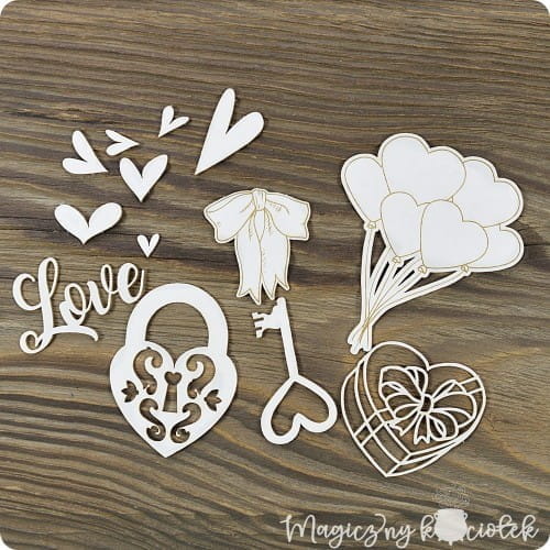 Zestaw tekturek przygotowany przez Magiczny Kociołek do kolekcji PassionScrap "Love is in the air" W zestawie znajduje się 13 elementów - kokardka, balony, kluczyk, kłódka, bombonierka, napis Love plus serduszka w różnych wymiarach. Wymiar arkusza 15cm Grubość beermaty 1mm
